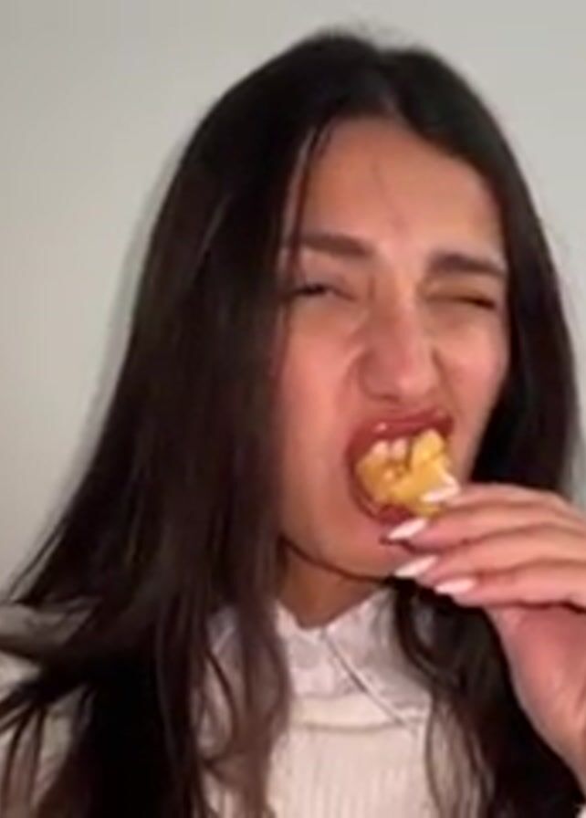 A young woman with long dark hair and fair skin is sitting on a gray couch and eating a small pastry. She is wearing a white sweater and has white nail polish. Her facial expression is one of mild disgust or displeasure. The background is a plain white wall. The video appears to be taken from a selfie perspective.