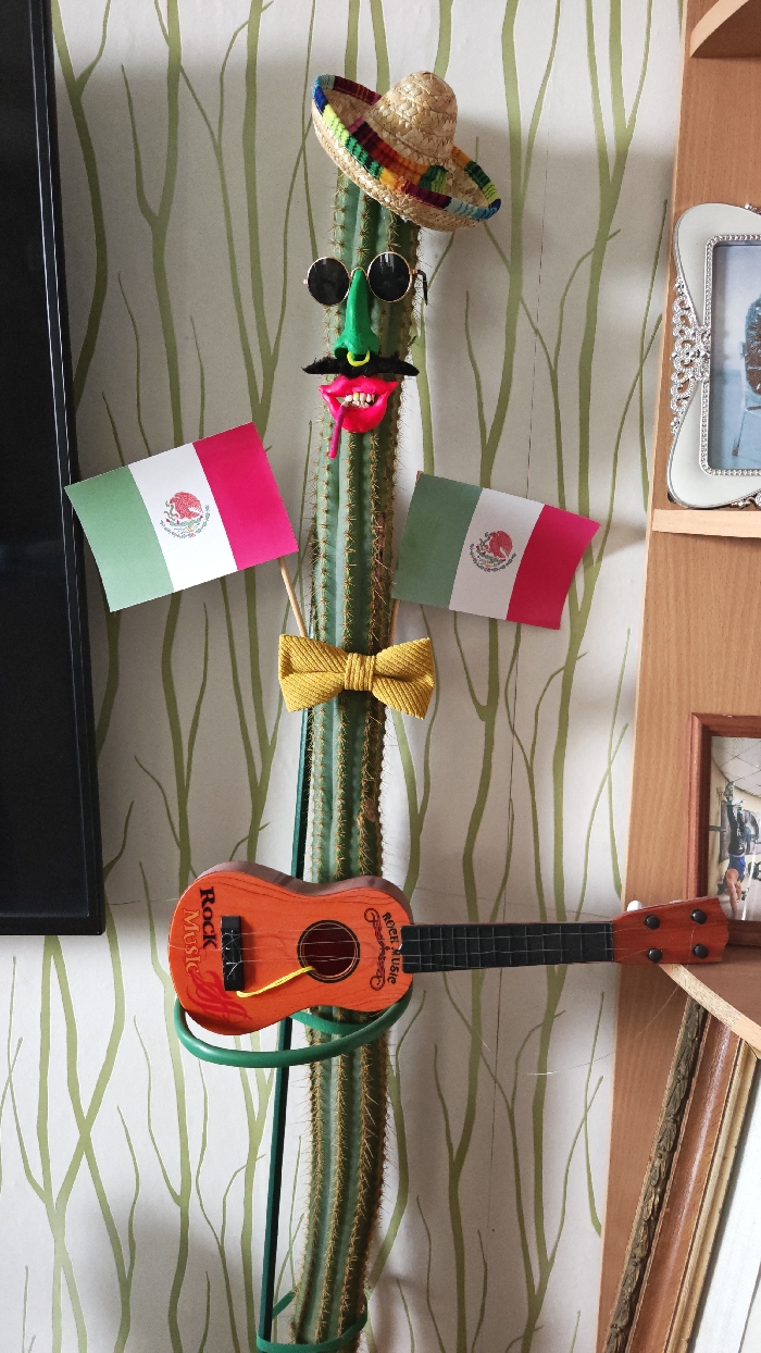 The scene depicts an indoor environment, presumed to be a residence in Rostov Veliky, Russia, featuring a tall, spiny green cactus decorated with festive accessories. The cactus, centered in the frame, is supported by a dark green metal pole and green plastic ties. Adorning the cactus from top to bottom are a miniature straw sombrero with a multi-colored brim, black-framed circular sunglasses, a green conical nose, a black stick-on mustache with a gold-colored ring, and bright pink artificial lips with visible white teeth and a protruding red tongue. Two small Mexican flags, each displaying green, white, and red vertical stripes with the national coat of arms, are inserted into the cactus: one to the left and one to the right, at mid-height. Below these, a yellow ribbed fabric bow tie is attached to the cactus. Towards the bottom, an orange toy guitar, inscribed with "Rock Music" and a red flame graphic, is suspended horizontally by a green plastic ring connected to the support pole. The background consists of a light-colored wall with a subtle pattern of stylized, pale green vertical lines resembling branches. To the far left, a portion of a dark, rectangular object, possibly an electronic display or furniture, is visible. On the right, a wooden shelving unit holds a silver-colored ornate picture frame with a blurry image, and below it, another wooden picture frame containing a blurry image. The top edge of a larger, ornate gold-colored frame is partially visible at the bottom right. No individuals are present in the image, and the scene is static.