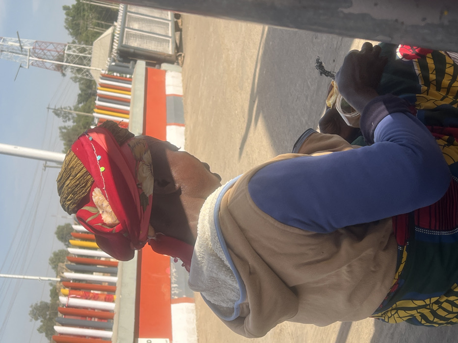 An individual, likely an adult female, of African descent, is depicted outdoors, positioned from the right side, facing downwards and slightly to the left. She wears a red headwrap adorned with floral patterns and colorful beads, topped with a green-brown textured fabric. Her attire includes a beige hooded fleece vest with a cream lining over a blue long-sleeved shirt, and a vibrant yellow, blue, red, and black patterned wrapper (skirt) around her lower body. Her hands are engaged with small items; the left hand holds a dark, possibly leafy or stringy object and a clear plastic container, while the right hand is partially obscured, holding a lighter-colored object, possibly another container. The background features a low concrete barrier, painted orange at its base, white above, and topped with black and white stripes. Behind this barrier are vertical poles or bollards, painted in alternating red, white, and orange. Further to the right, a tall metal lattice communication tower stands against a clear blue sky, adjacent to a grey metal gate or fence structure. The ground is unpaved, light brown, and exhibits strong shadows, indicating direct sunlight. This scene is located at the **Railway Terminus area in Jos, Plateau State, Nigeria**.