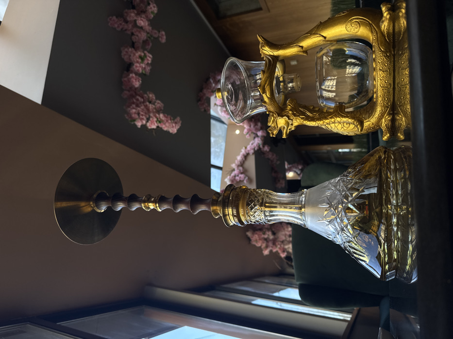 The image depicts an interior scene within an upscale lounge or cafe in Sofia, Bulgaria, consistent with venues such as Kino Shisha. Two prominent objects rest on a dark, reflective table surface. On the left, a tall, ornate hookah is positioned. Its base is a clear, faceted crystal-cut glass vessel, containing an amber-colored liquid, with a frosted transition band near its neck. The stem is constructed from polished brass and dark, turned wooden sections, culminating in a flat, circular brass ash tray at the top. To the right, a gilded, stylized dragon-shaped tea dripper stand supports two clear glass components. The upper component is a wide, shallow bowl with a small lid, resting atop the dragon's head. The lower component is a spherical glass vessel situated within the dragon's body, designed to receive liquid. The background features a large window on the left, providing natural illumination. Behind the hookah, a dark green velvet armchair is partially visible. The ceiling exhibits segments of dark brown and lighter-toned panels, from which artificial pink cherry blossom branches are suspended in decorative arches. No individuals, actions, or interactions are present in the static scene.