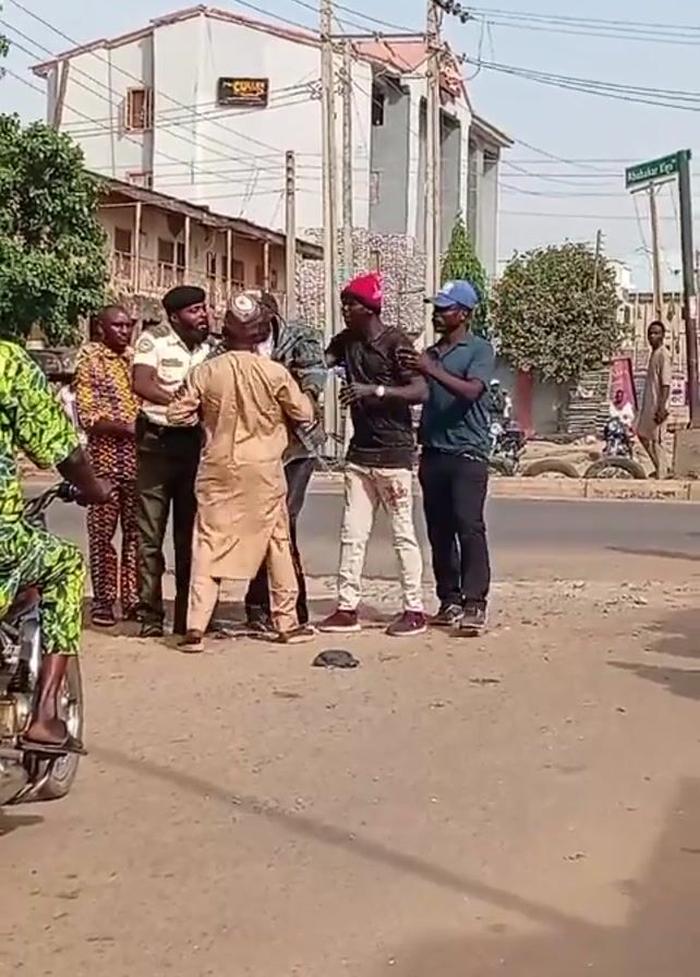 group of men seemingly in a heated discussion or altercation on a street corner in what appears to be a sunny, urban environment. The group includes men in civilian clothing, some wearing caps and traditional attire, and at least two individuals who seem to be security personnel in uniform. They are gesturing and talking animatedly, but it's difficult to discern the exact nature of their interaction without audio. A man on a motorcycle wearing a green and yellow patterned outfit is parked on the side of the group, seemingly observing the situation. The street is paved, and there are buildings, trees, and overhead power lines visible in the background. The presence of a street sign and other pedestrians suggests this is a public space.