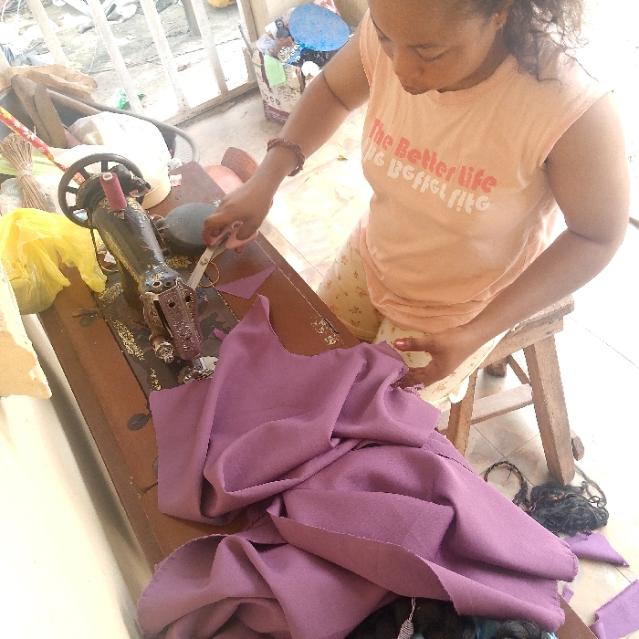 A female individual is depicted in the city of Unknown, Unknown, seated on a wooden stool while performing a textile-related task. She wears a light orange sleeveless t-shirt featuring "The Better life" text and patterned shorts. Her attention is focused on a large piece of purple fabric, which she is actively cutting with silver scissors. The fabric rests on a dark wooden table that houses an antique black, cast-iron sewing machine. Small, triangular purple fabric scraps are visible on the tabletop. To the left of the sewing machine, a yellow plastic bag is present. In the background, a tiled floor and metal railings are visible, along with various items including a blue basin, bags, and brooms. A bundle of dark hair extensions or similar material lies on the floor to the bottom right of the primary subject. The scene suggests a home-based tailoring or crafting operation.