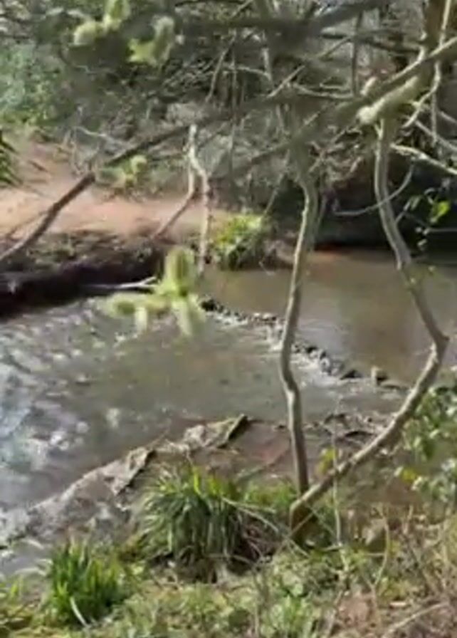 small stream flowing through a wooded area. The water is slightly murky and moves quickly over rocks. A dirt path runs alongside the stream. The foreground features a small tree branch with fuzzy buds, partially obscuring the view. Green vegetation grows along the banks of the stream. The lighting indicates it is daytime, with dappled sunlight filtering through the trees. No people are visible.