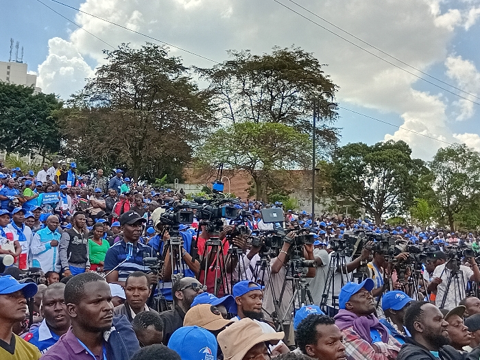 The image displays a large outdoor public gathering in Nairobi, Kenya, under a partially cloudy sky. A dense crowd of individuals, predominantly male, fills the frame from foreground to background. Many attendees wear blue caps and blue or white branded attire, including shirts and hoodies, indicating participation in a political or public event. Numerous professional video cameras, mounted on black tripods, are prominently positioned in the mid-ground, operated by media personnel actively filming the scene. The crowd exhibits attentiveness, with many individuals looking forward and slightly upwards, suggesting focus on an event or speaker beyond the frame. In the background, mature trees are interspersed with urban architecture, including a modern multi-story high-rise building with a light-colored facade and a distinct older building featuring a red-tiled roof and light-colored walls. Overhead power lines or communication cables are visible against the sky. A light blue banner with partial white Swahili text "GUSA POPOTE BORA BADO" is visible within the crowd. The location is an urban public space in Nairobi, Kenya, likely within the central business district or its periphery, characterized by public gathering areas adjacent to government or institutional buildings and green spaces.