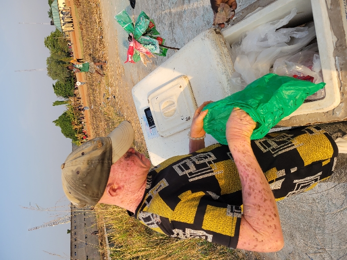 An albino person wearing a yellow and black patterned shirt and a tan baseball cap is shown holding a green plastic bag. They are next to a white cooler filled with plastic bags and other items. In the background, a field with people and buildings is visible, along with a partly cloudy sky. The ground is covered in dry grass and concrete. A collection of colorful plastic bags attached to sticks stands beside the cooler.