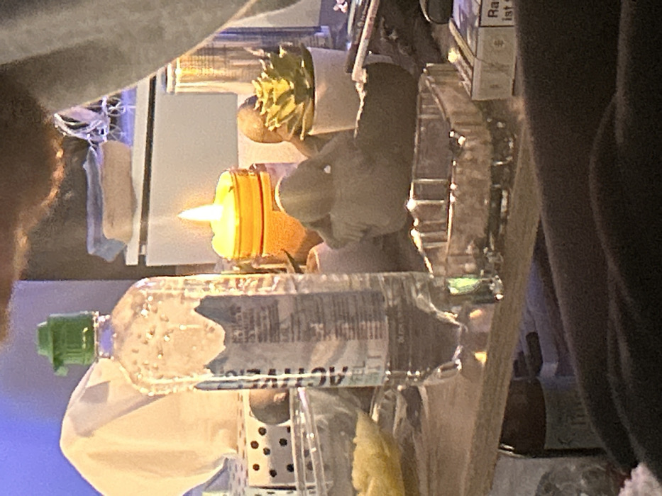 - "A cluttered table holds a water bottle, a lit candle in a yellow holder, and a small potted plant" by FM-aYYtj2, licensed under CC BY 4.0