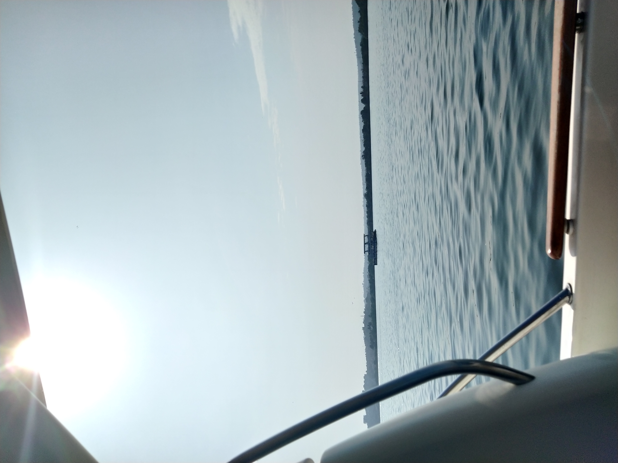 view from a boat on the Mandovi River in Panaji, India. The water is rippled and reflective. A distant shoreline with vegetation and a pier-like structure is visible. A bright sun is obscured by a boat structure in the foreground on the left. The right side of the image shows boat hardware, including part of a railing and paneling.