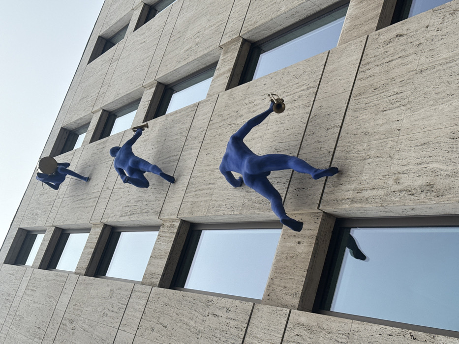 Three blue, headless, nude, male-form sculptures are affixed to the light-beige, textured stone facade of a multi-story building