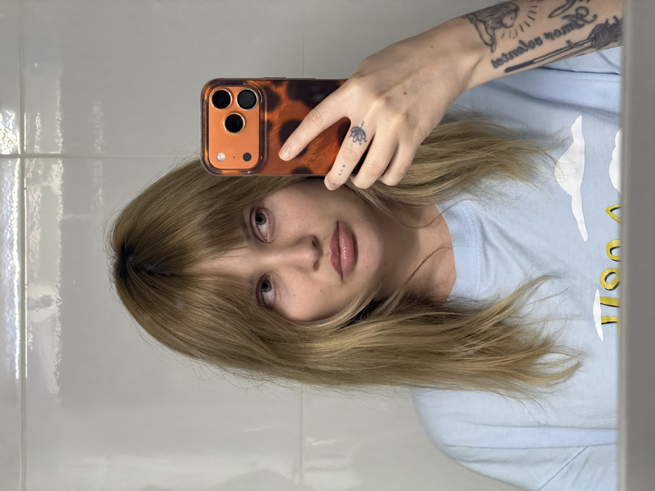 An indoor scene in Nahariyya, Israel, depicts a female subject taking a mirror selfie. The subject, an individual with long, light brown hair styled with bangs, is observed from the chest up. She wears a light blue short-sleeved t-shirt with a white graphic print on the front. Her right hand, positioned towards the viewer's left, holds a smartphone encased in an orange and black tortoiseshell patterned case with a visible triple camera system, indicating she is photographing her reflection. Distinctive features of the subject include a small three-dot tattoo vertically aligned on the side of her right index finger and a small lotus flower tattoo on the back of her right ring finger. Her left forearm displays extensive tattooing, including a hand reaching down, a broomstick, and partial Hebrew script reading "שלום עליכם" (peace be upon you). Her gaze is directed slightly to her right (viewer's left), with a neutral facial expression. The background consists of white tiled walls, suggesting a bathroom or similar interior space, with a reflective horizontal surface visible at the bottom of the frame.