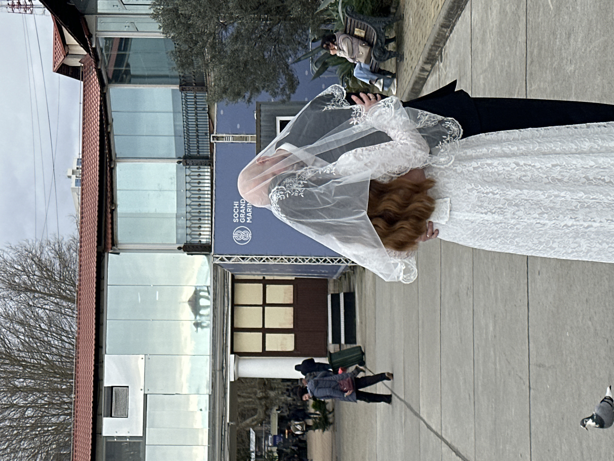 The image depicts a matrimonial couple kissing under a translucent white lace veil in an outdoor urban setting identified as the Sochi Grand Marina in Sochi, Russia, based on a visible blue banner displaying "SOCHI GRAND MARIN." In the foreground, slightly right of center, a woman with long reddish-brown hair, wearing a white, long-sleeved lace wedding dress, is seen from behind, embracing a bald man dressed in a dark suit. Their heads are obscured by the veil, which covers them both as they kiss, their faces pressed together. The woman's left hand is visible on the man's lower back, and her right arm is wrapped around his upper torso. Her left ring finger displays a band. The ground consists of light grey concrete pavers with visible seams. In the lower left, a pigeon with grey, white, and black markings stands on the pavement, facing left. In the midground, to the left of the couple, a paved pedestrian area extends into the distance. Several indistinct figures are walking; one woman in a dark blue coat and dark pants, carrying a burgundy handbag, walks left with a slight smile. Behind her, a person in a dark jacket pulls a green rolling bag. The background features a multi-story building with a red tiled roof. The upper section of the building has extensive glass windows that reflect the overcast sky and a distant gazebo structure. A section of the building below features a white column and dark brown double doors with six rectangular panels. To the right of the couple, a black metal bench is situated beside some green foliage, including an olive tree and an agave plant. A person wearing a light-colored jacket and blue jeans sits on the bench, looking down at their phone. Power lines are visible against the cloudy sky above the buildings.