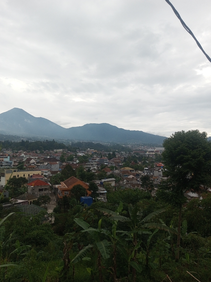 The image depicts an elevated panoramic view of a densely developed urban area, identified as Bhupalpally, India, situated within a valley or basin, framed by hills and mountains under a heavily overcast sky. The foreground features dense, dark green tropical vegetation, including large-leafed plants and shrubs, with a dark electrical cable or wire extending diagonally from the top right towards the center. The midground encompasses a sprawling settlement characterized by numerous buildings with diverse roof colors, predominantly red, orange, and gray, indicating a mix of residential and commercial structures. The buildings vary in height and density, interspersed with scattered trees. No individuals, specific actions, or interactions are discernible. The background is dominated by a range of hills or mountains, appearing dark blue-green due to distance and atmospheric conditions, stretching across the horizon. The sky is uniformly cloudy with light gray and white tones, suggesting an overcast day.