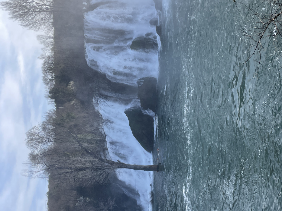 The image displays the Kravica Waterfalls, located near Zvirići, Bosnia and Herzegovina. Multiple wide cascades of white water descend over tiered rock formations into a broad, turbulent river. The river's surface is a dark greenish-blue, exhibiting ripples and some white foam, especially closer to the base of the falls. A large, bare-branched deciduous tree trunk stands partially submerged in the river on the left side, positioned directly in front of a waterfall section. Several large, dark, moss-covered rocks are visible within and at the base of the waterfalls. The surrounding land above the falls is densely covered with leafless deciduous trees and some evergreen vegetation. A faint horizontal line, possibly a wire or rope, with small orange buoyant objects attached, is discernible just above the water level at the base of the falls. The scene is enveloped in a light mist emanating from the powerful water flow. The sky above is partly cloudy with areas of pale blue and white clouds. No human figures or discernible man-made structures other than the potential cable/buoy system are visible.