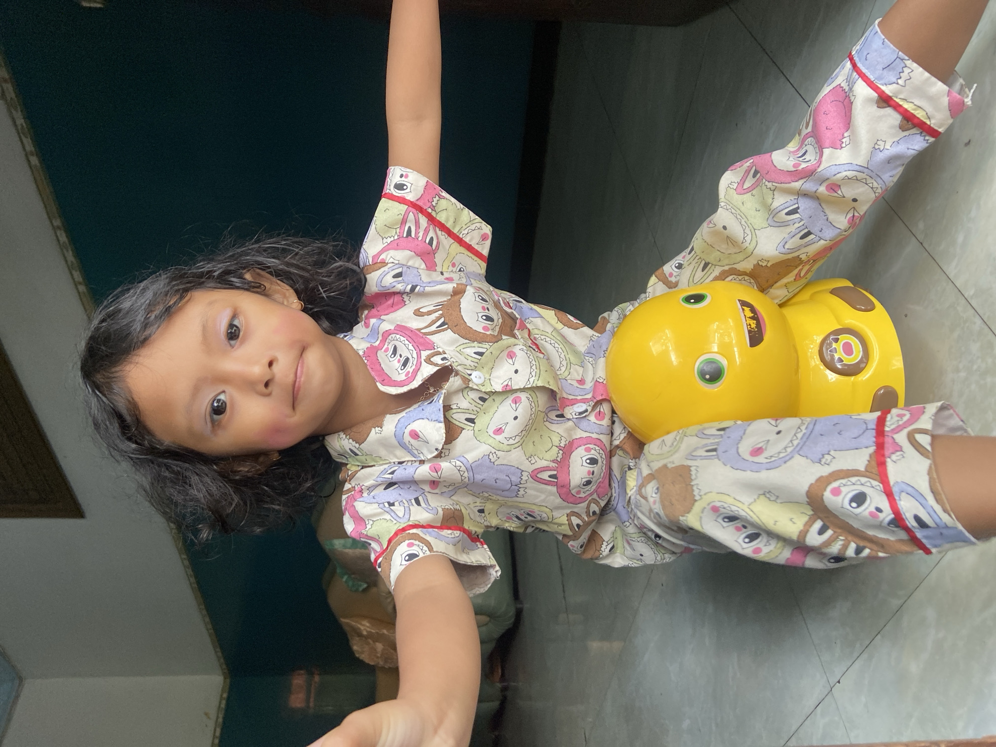 A young child in patterned pajamas straddles two yellow toy vehicles with smiley faces, their arms outstretched. The location appears to be indoors, possibly a residential setting with blue and white walls and tile flooring. The city is Gelam, Indonesia.