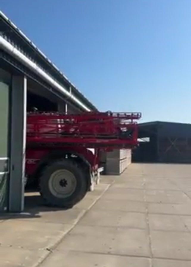A red Agrifac agricultural sprayer is partially visible, situated directly outside a large sliding door of a metal building on a clear, sunny day. The building is long with a grey and white exterior. The sprayer's large tires and intricate metal framework are prominent. Next to the sprayer is a neat stack of materials. The ground is concrete. In the background, a larger, darker structure is visible.