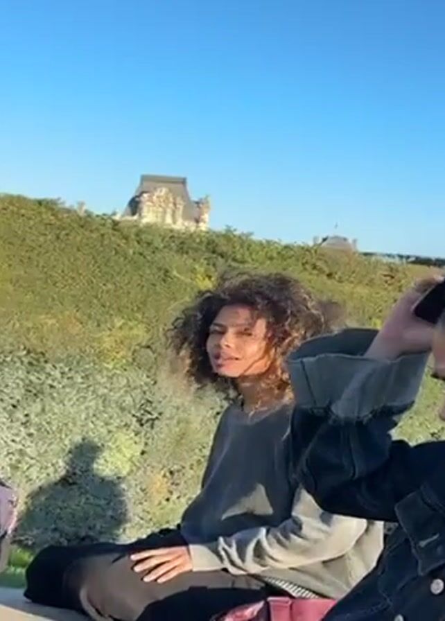 Three young women are sitting outdoors in front of a hedge, seemingly on a grassy slope, with a large building visible behind them. One woman is sitting cross-legged in dark clothing on the left of the frame. Another young woman, who is facing right, is wearing a gray top. The third woman is sitting to her right, wearing a dark denim jacket and pants. The camera focuses on the woman in the gray top. She sticks out her tongue. The building in the background is light-colored and ornate. The sky is clear and blue.