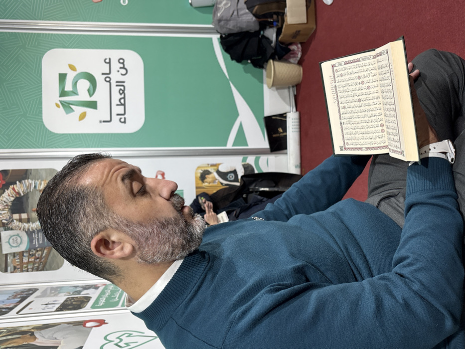 This image depicts an indoor scene in the city of Al-Ghizlaniya, Syria, showing a man seated, focused on an open book. The man, with dark hair and a short, gray beard, wears a teal-blue long-sleeved sweater over a white collared shirt and dark gray trousers. He is holding a hardbound book, open to pages displaying Arabic script, and appears to be reading or reciting. A white wristwatch is visible on his left wrist. The environment features a red carpeted floor. In the background, a large green and white banner displays the number "15" with leaf designs and Arabic text, which translates to "15 years of giving." To the left, a portion of another banner with images is visible. Additional background elements include a white waste bin, a brown cardboard box, miscellaneous bags or clothing, and a black folder or case. Indistinct figures and a cutout image of a man are also visible further in the background.