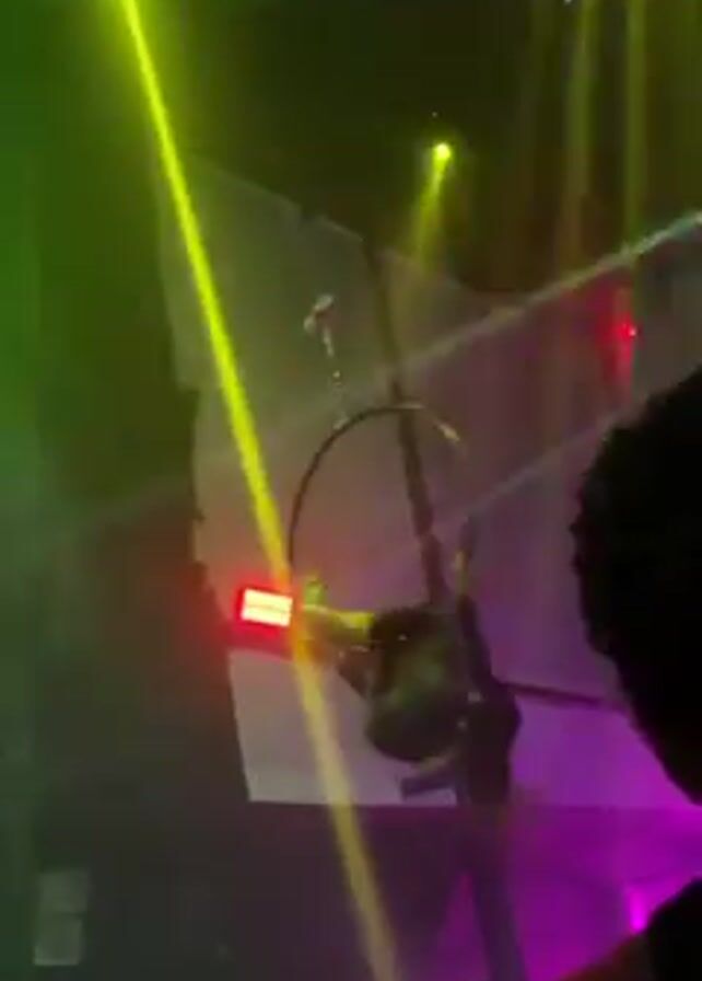 woman performing acrobatics on a hoop suspended from the ceiling in what appears to be a nightclub or event space. The woman is wearing a light green bodysuit. There are stage lights shining on her in green and yellow. In the foreground, a person with curly hair is partially visible, seemingly watching the performance. The background includes a white screen or wall with some colored lighting. The music is loud, adding to the ambiance of a party or entertainment venue.
