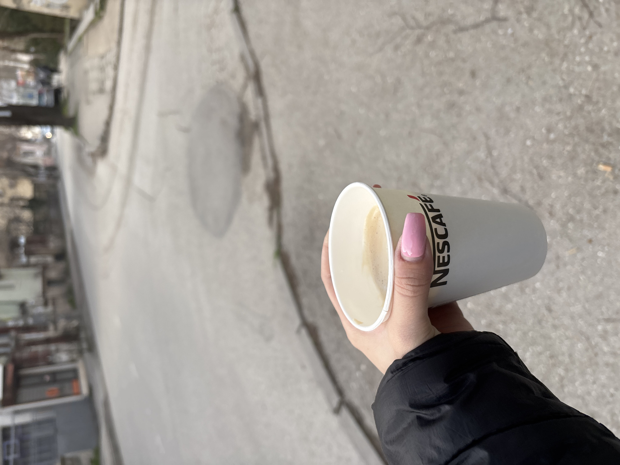 A close-up, first-person perspective image depicts a right hand, manicured with pink nail polish, holding a white "NESCAFÉ" branded paper cup containing a light brown, frothy beverage
