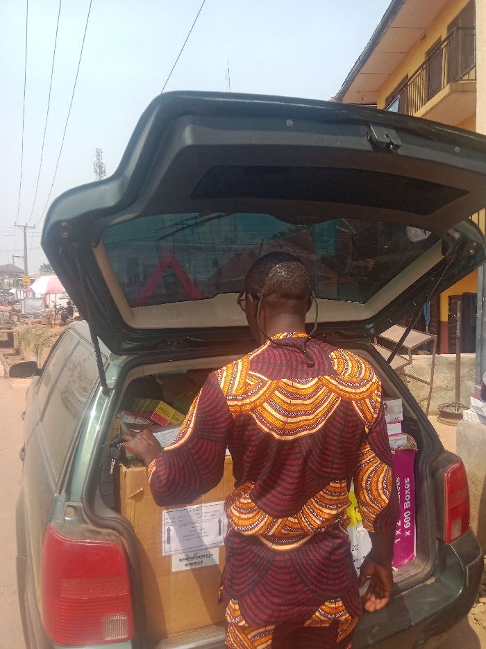 An overhead-angle image captures a male individual from behind, positioned at the open rear hatch of a dark green station wagon, on what appears to be an unpaved surface in Aguata, Nigeria