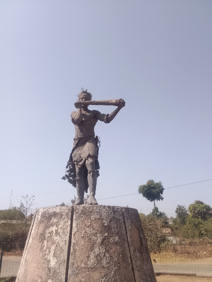 An outdoor photograph, captured in Jos, Nigeria, prominently features the "Nok Man" statue, situated at the Yakubu Gowon Airport roundabout