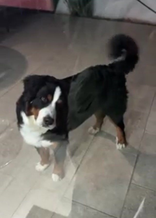 The video depicts a Bernese Mountain Dog standing indoors on tiled flooring and looking towards the camera through glass doors