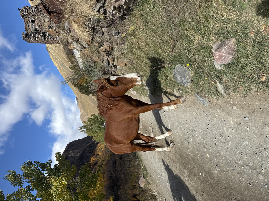 - "A chestnut horse stands prominently on a gravel path in Kvemo Okrokana, Georgia, under a bright blue sky with scattered white clouds" by FM-Sep6K2, licensed under CC BY 4.0