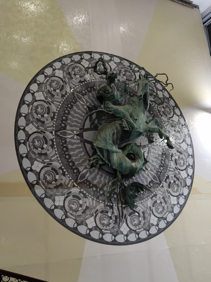 A wall-mounted, circular artwork features a teal-colored sculpture. The sculpture depicts a figure riding a sea horse. The background is a patterned disc with concentric circles containing geometric shapes and fish motifs in grayscale. The wall is pale yellow with lighter accents. The image is slightly tilted, suggesting it was taken from a low angle.