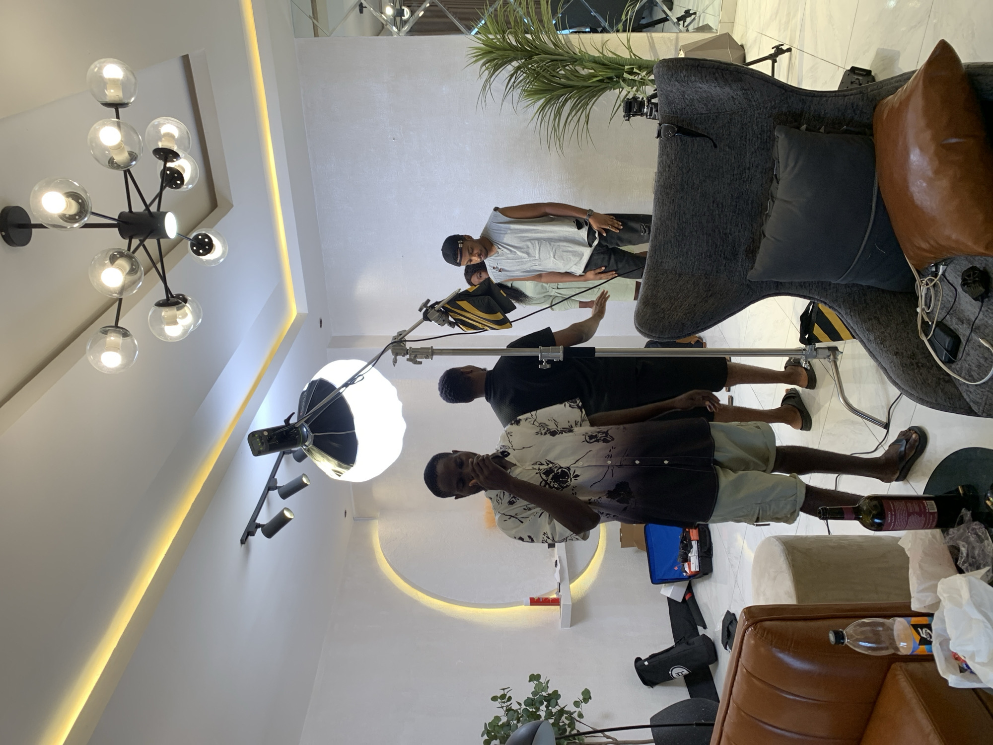The image depicts an indoor scene within a modern studio or well-lit room in Moba, Nigeria, arranged for a photographic or videographic shoot