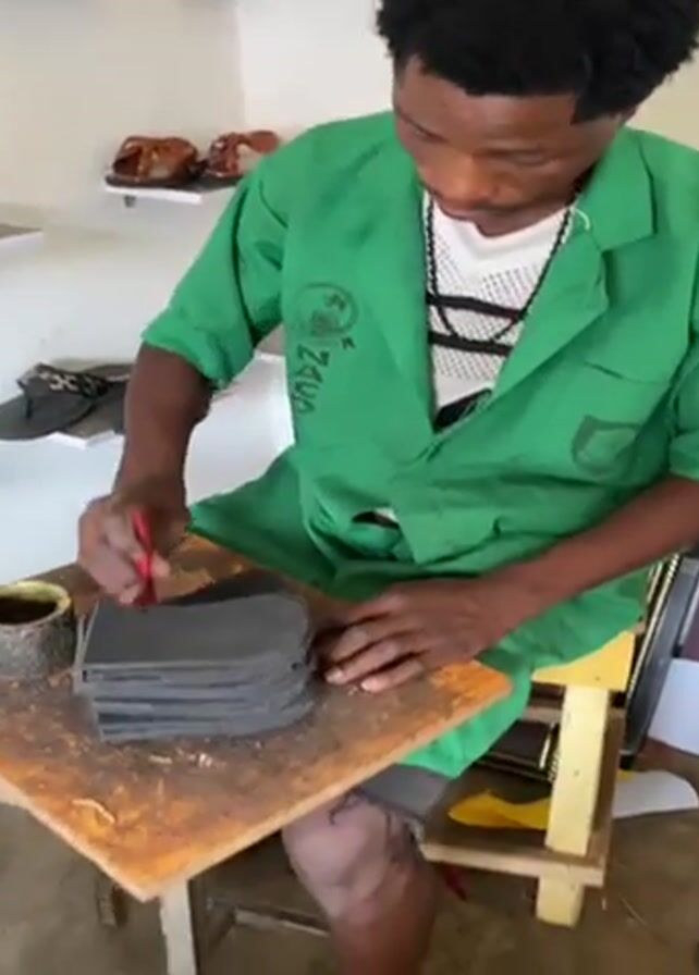man in a green jumpsuit cutting black foam pieces with a blade. He is at a small, brown table with a pile of foam pieces and a jar of adhesive. The camera then pans to a second man in a red shirt and baseball cap sitting on the floor. He is surrounded by cut pieces of foam and is piecing them together. There are two framed art pieces on the wall behind him. One says “PRAY” and the other is an image of praying hands. Shelves with sandals on them are visible along the top of the wall.