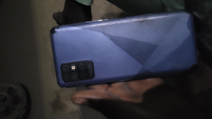 A blue smartphone with a geometric pattern on its back panel is held in a hand. The phone's camera module, containing multiple lenses and an LED flash, is visible in the upper left corner. The phone's back is worn at the edges, and the surfaces of the panel are reflecting light. The surrounding environment appears dark, suggesting the photo was taken indoors with limited lighting.