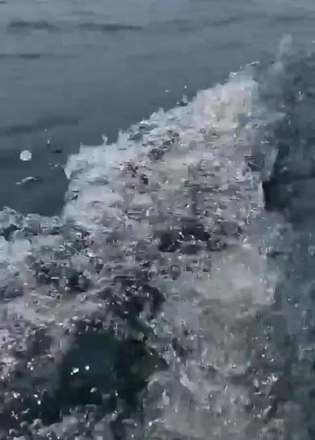 side of a boat moving through the water, creating a wake of white foam and spray. The sea is a dark, muted blue, with a horizon that suggests a slightly overcast or hazy sky. The camera angle is close to the water's surface, emphasizing the motion and turbulence caused by the boat's passage. The boat is moving fairly quickly, resulting in a significant churn in the water.