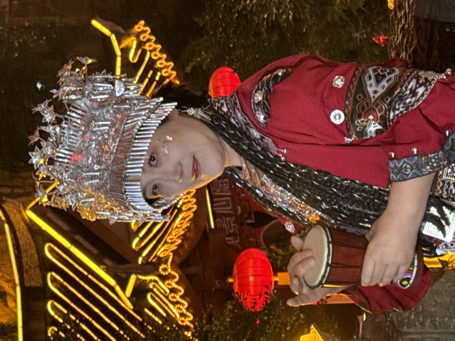 - "A medium-shot, nighttime photograph depicts an adult East Asian female in traditional attire, holding a small hand drum, within a brightly illuminated outdoor setting in Yuzhong District, China" by FM-K0Kp62, licensed under CC BY 4.0