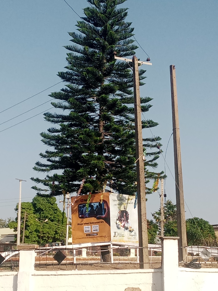 The image depicts a tall evergreen tree standing beside two concrete utility poles. Electrical wires run along the poles and through the tree's upper branches. Two promotional banners are displayed around the tree's base, advertising 'latest Nollywood hits' and a 20th-anniversary event for a foundation. The area is enclosed by a low, decorative fence with a white and brown color scheme. More greenery can be seen in the background beneath a clear blue sky.