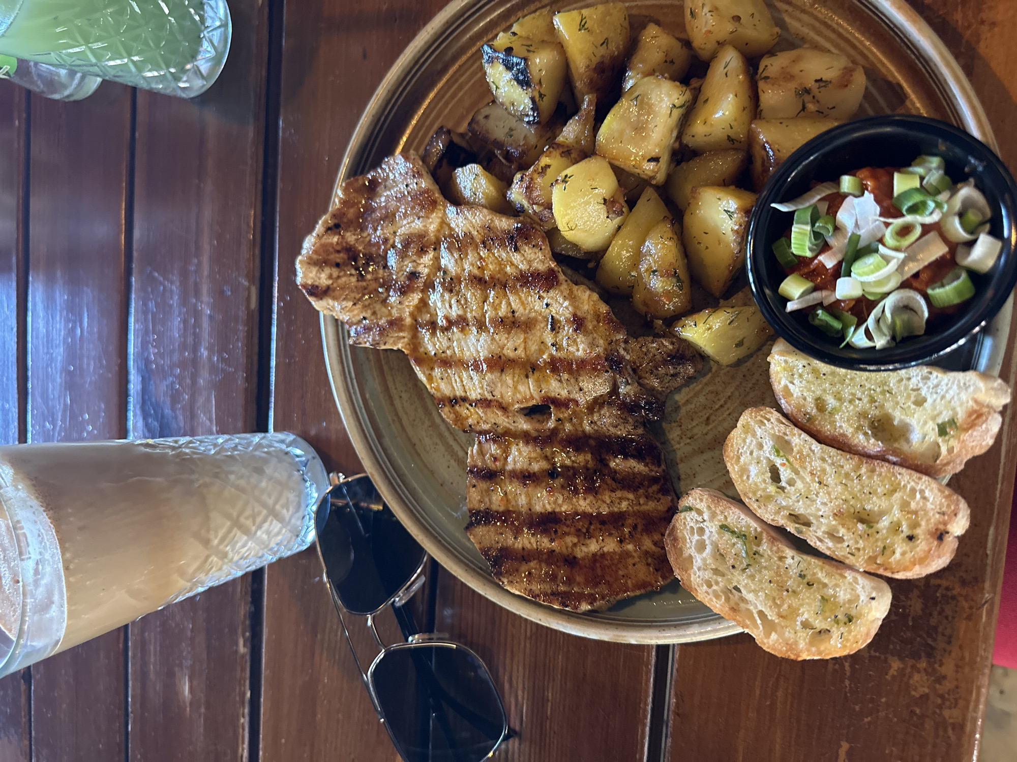 A medium-angle shot depicts a plate of food on a wooden table in Pernik, Bulgaria. The main dish comprises a grilled pork chop with distinct grill marks, accompanied by roasted potatoes seasoned with herbs, likely dill. Adjacent to the potatoes is a small black bowl filled with a tomato-based sauce, topped with sliced green onions. Several slices of garlic bread are also arranged on the plate. To the left of the plate, a glass of what appears to be a smoothie or milkshake rests on its side, and nearby, a pair of aviator-style sunglasses is situated. A glass of a green liquid can be seen in the background. The wooden table exhibits a rich, warm tone and provides a rustic backdrop for the food presentation. The lighting suggests an indoor setting, possibly a restaurant or café.