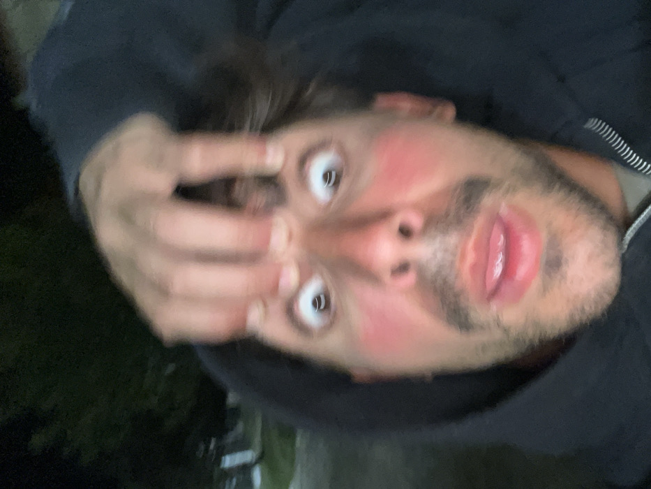 A close-up, slightly blurry selfie shows a man with dark hair and a light beard