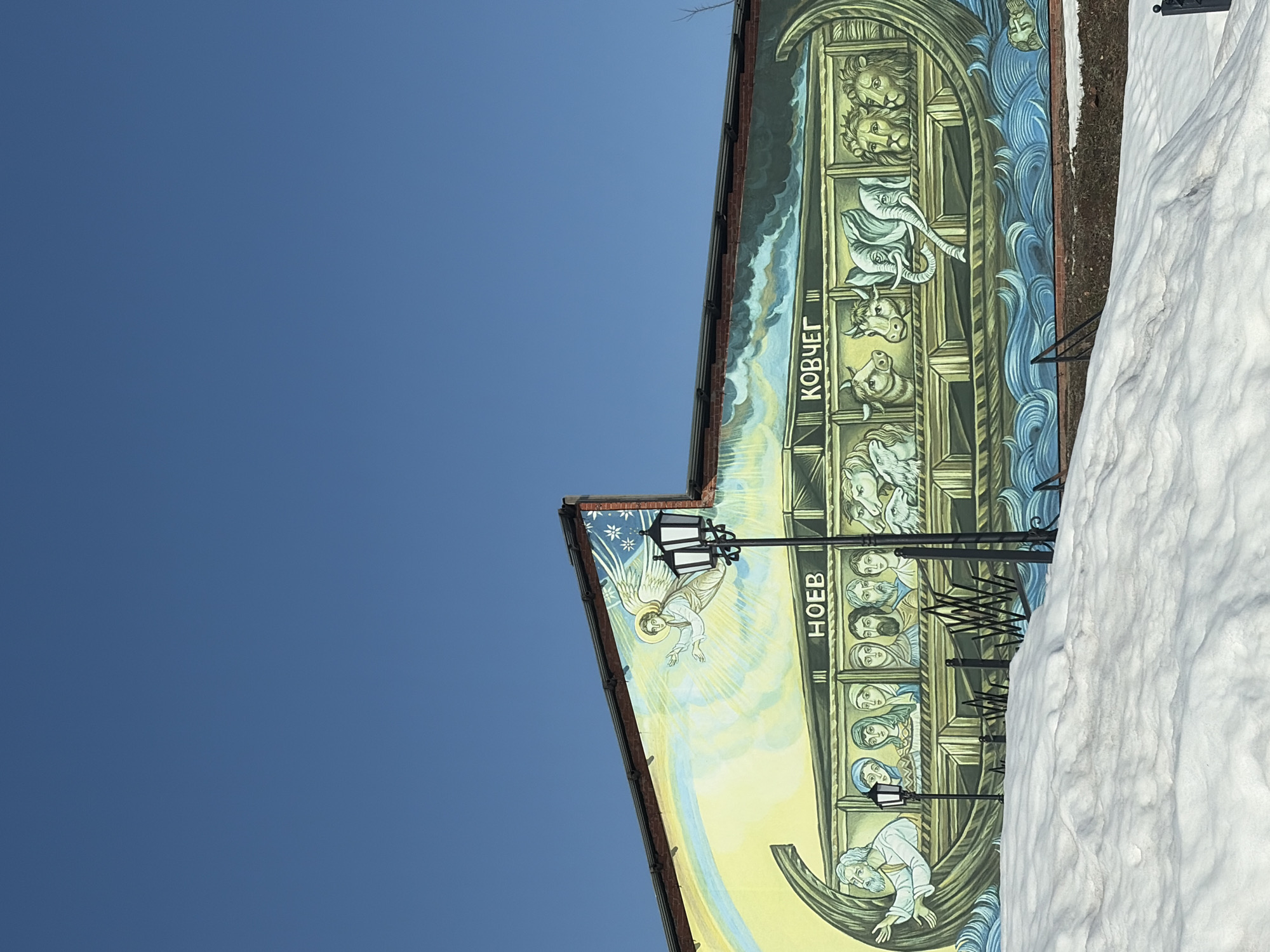 A low-angle, outdoor shot captures a large mural on the side of a building under a clear blue sky, located in Кварса, Russia. The mural depicts a stylized Noah's Ark, with "НОЕВ" (Noah) visible on the left section of the ark and "КОВЧЕГ" (Ark) on the right section. The ark is shown floating on blue, wavy water. Human figures, including a bearded man (Noah) with outstretched arms, occupy the left compartments of the ark, while pairs of animals—including sheep, cows, elephants, and lions—are visible in compartments on the right. Above the ark, on the left, an angel with a halo and wings is depicted amidst a yellow-blue glow and a rainbow arc. The upper right portion of the mural features dark clouds and snowflakes. The building wall below the roofline is visible as a dark brick section. In the foreground, a substantial uneven mound of white snow covers the ground, obscuring the base of the mural. A black ornamental lamppost with a dual lantern is prominently positioned in the mid-ground, partially obscuring the mural. A second, smaller lamppost is visible further left. Black metal fencing or railings are present behind the snow mound. The sky is uniformly clear and bright blue.