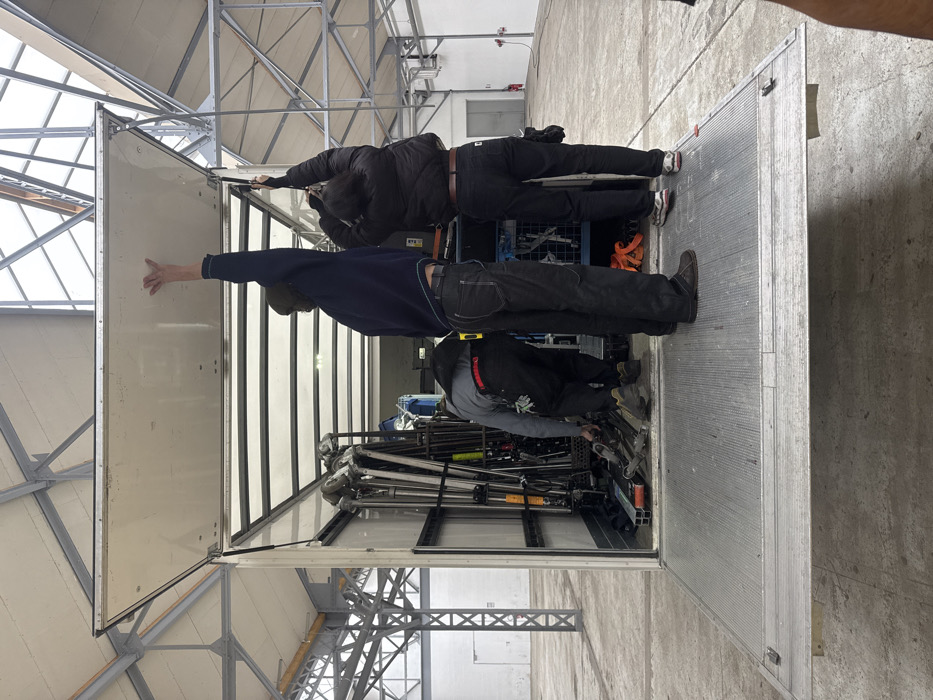 The image depicts three individuals interacting with the rear cargo area of a white truck or trailer inside a large industrial or warehouse building located in Ivry-sur-Seine, France. The truck's lower tailgate is horizontally deployed, serving as a ramp, and its upper rear door is open vertically, extending upwards. The first individual, positioned centrally, wears a dark blue long-sleeved top and dark trousers, standing with their back to the viewer. Their right arm is extended straight overhead, with the hand flat against the underside of the open upper door of the truck. The second individual, to the right of the first, wears a dark puffer jacket and dark trousers. Their back is also to the viewer, and both arms are extended upwards, appearing to operate or secure a mechanism related to the upper door on the right side. The third individual is positioned inside the truck, bent forward with their back partially visible. They wear a grey long-sleeved top and dark work trousers with red accents, and are actively engaged with various pieces of metal equipment stored within the truck's interior. This equipment includes multiple silver-colored poles, stands, and other components, possibly for stage or lighting setups, organized along the truck's internal racks. Orange cargo straps are also visible inside. The environment is a large, sparsely furnished industrial space with a light grey concrete floor. The ceiling features exposed metal trusses and a series of skylights, indicating a high-ceiling structure. White walls are visible in the background. A distinctive metal support pillar with a lattice-like structure is visible on the left side of the frame. The scene suggests activities related to loading, unloading, or organization of technical equipment within a production or event context.