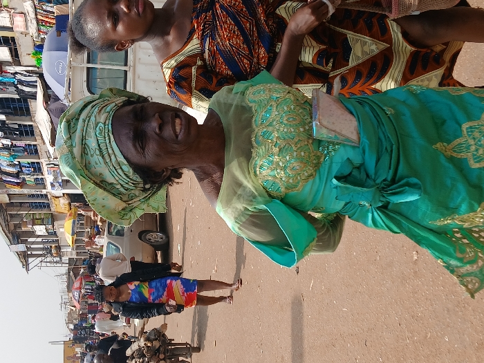 The image depicts a daylight street scene in Heany, Zimbabwe, on an unpaved reddish-brown dirt road. In the foreground, an adult female with dark skin is positioned centrally, angled slightly left. She wears a light green patterned headwrap and a green embroidered dress with sheer sleeves. A light-colored rectangular object is secured at her left hip within a waist sash. Her mouth is open, revealing teeth. To her right, a second female, younger in appearance, is partially visible, wearing a patterned dress in brown, orange, and black, and carrying a light-colored woven bag. Both individuals appear to be moving forward. In the midground, from left to right, a figure pushes a wooden cart loaded with logs. A female in a black jacket over a multi-colored dress and sandals walks away from the viewer. A light-colored sedan is present, followed by another individual in light-colored clothing. The background consists of multi-story buildings with facades displaying clothing, indicative of commercial establishments. Multiple market stalls are visible, marked by colored umbrellas, one bearing 'NIVEA' branding. A white pickup truck is partially visible on the right. The sky is bright overhead.