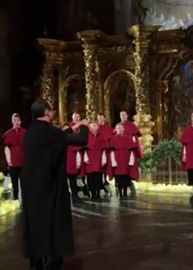 A male choir director dressed in a black cloak faces a group of male choristers who are wearing red robes with white trim. The choristers are standing in front of an ornate gold structure that might be an altar, and there are numerous candles arranged in front of the choir. The choir director is actively conducting the choir with sweeping hand motions. The scene appears to be inside a church or other religious building, given the architectural style and decorations.