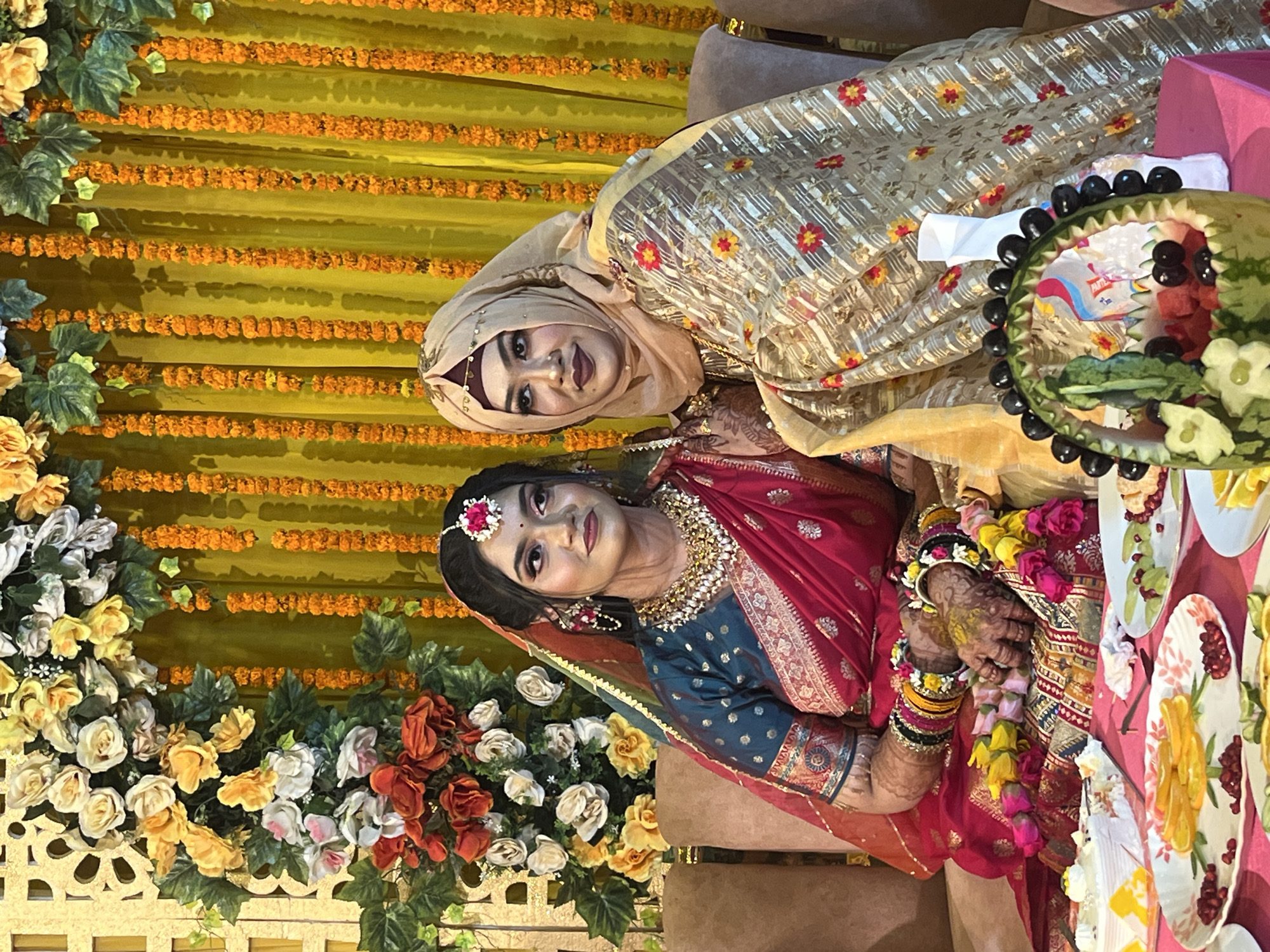 The image depicts two women seated on a brown cushioned sofa in an indoor setting in Savar, Bangladesh, characterized by celebratory decorations. The backdrop features a bright yellow fabric draped with multiple vertical strings of orange marigold garlands. The left side of the background reveals a gold lattice-patterned screen, and an arcing floral arrangement composed of white, yellow, orange, and red roses with green foliage. The woman on the left is positioned slightly forward and is adorned in formal attire. She wears a dark teal blouse with gold embroidery and a magenta/red saree with gold patterns, complemented by a red sheer veil. Her dark hair is styled, and she wears a pink and white floral hair ornament. Her visible hands display intricate mehndi designs and are draped with pink and yellow floral garlands. She wears numerous bangles of various colors and an elaborate gold necklace with white stone embellishments, along with matching earrings. Her gaze is directed upwards and to the right, away from the viewer. The woman on the right is seated slightly behind the first, wearing a light brown/beige hijab that covers her head and neck. She is draped in a gold-colored shawl or saree with distinct red and yellow floral patterns. A subtle gold chain with small adornments is visible across her forehead under the hijab. Her gaze is directed towards the viewer. In the foreground, a table covered with a pink tablecloth displays several food items. These include a partially consumed white cake with yellow accents, a white plate containing decoratively arranged sliced oranges garnished with pomegranate seeds, and a carved watermelon basket filled with fruit, including watermelon chunks and dark grapes, with additional grapes adorning its rim. A white napkin stands upright behind the watermelon.