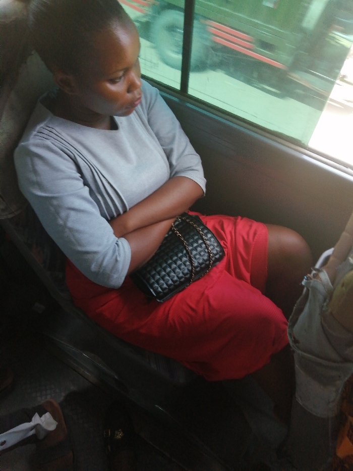 A woman is seated inside a vehicle, possibly a bus, near a window. She wears a gray top with three-quarter sleeves and a red dress or skirt. Her arms are crossed, and a black quilted purse with a gold chain strap rests on her lap. Outside the window, a blurred image of a green vehicle with red stripes is visible. Another person is partially seen to her right, wearing white shorts or pants. The lighting is soft, suggesting it might be daytime.