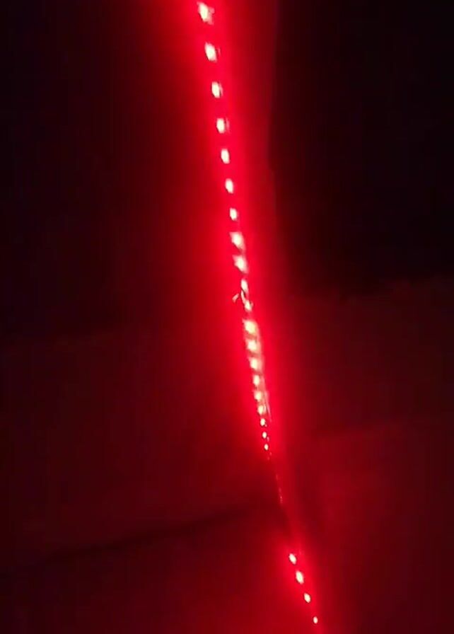 single strip of LED lights changing color. The lights are initially green, then transition to red, and finally to blue. The lights are in a dark environment, suggesting they might be indoors or at night. The camera angle is low, looking upwards at the light strip. The background is dark and mostly out of focus.