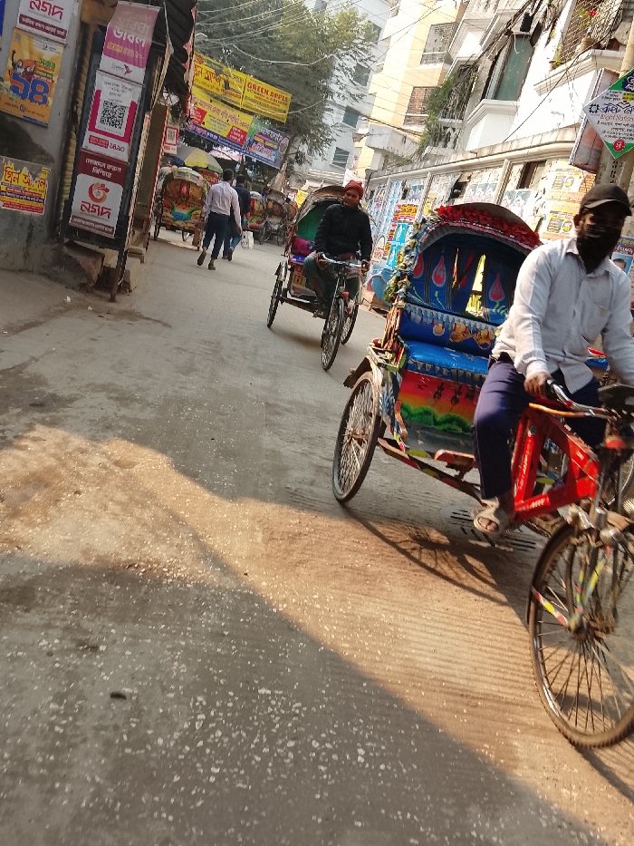 A narrow street scene showcases several rickshaws, with two in motion. The rickshaw in the foreground is painted with vibrant blues, greens, and reds, driven by a person wearing a white shirt and dark pants. Another rickshaw follows, driven by someone in a black jacket and hat. Several individuals walk in the distance. Buildings flank both sides of the street, adorned with various signs and banners. The lighting suggests it's daytime with shadows cast on the road.