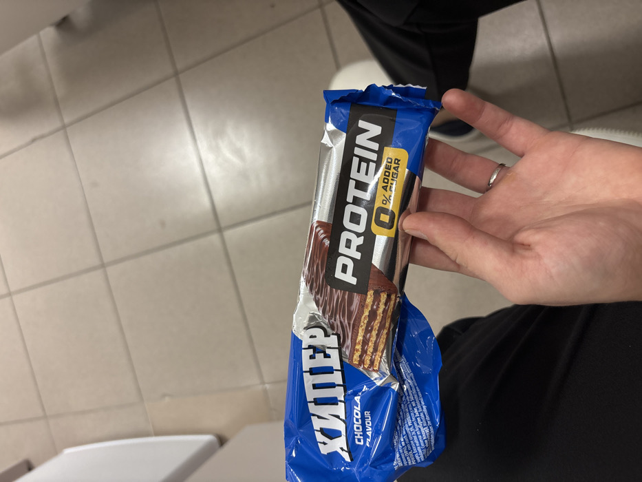 - "A person's left hand, adorned with a plain silver ring on the ring finger, holds a partially opened "ХИПЕР" (HI-PER) brand protein bar" by FM-5DUb62, licensed under CC BY 4.0