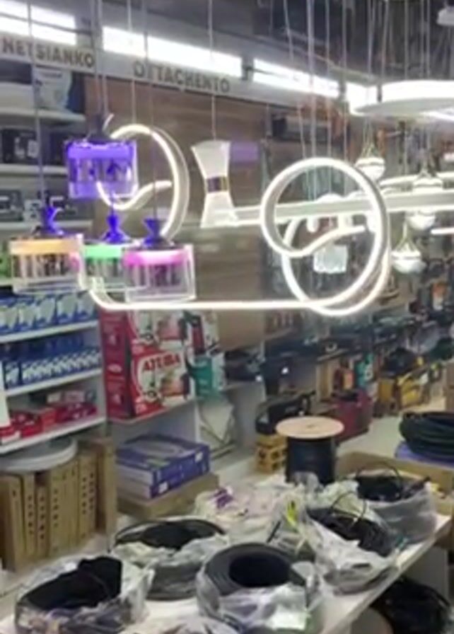 The camera pans across a store selling electrical supplies and lighting fixtures