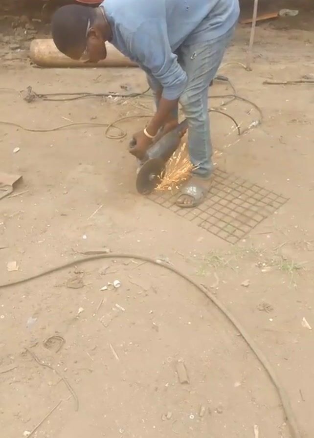 A person wearing a light blue long-sleeved shirt, blue jeans, and sandals is using an angle grinder on a metal grid on a dirt surface