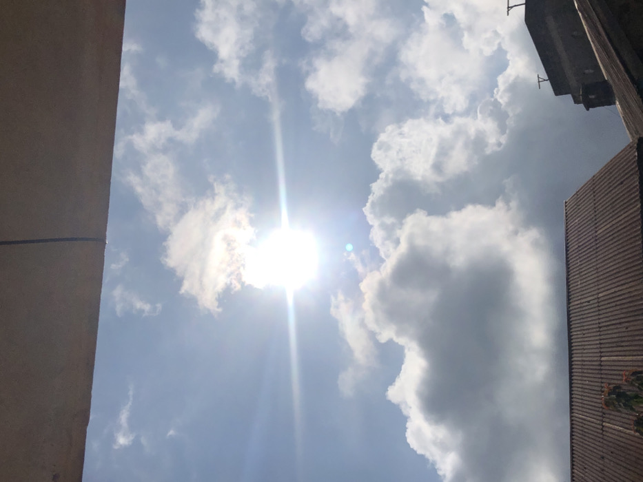 A low-angle shot reveals a bright sun with rays, peeking through scattered white and gray clouds in a blue sky