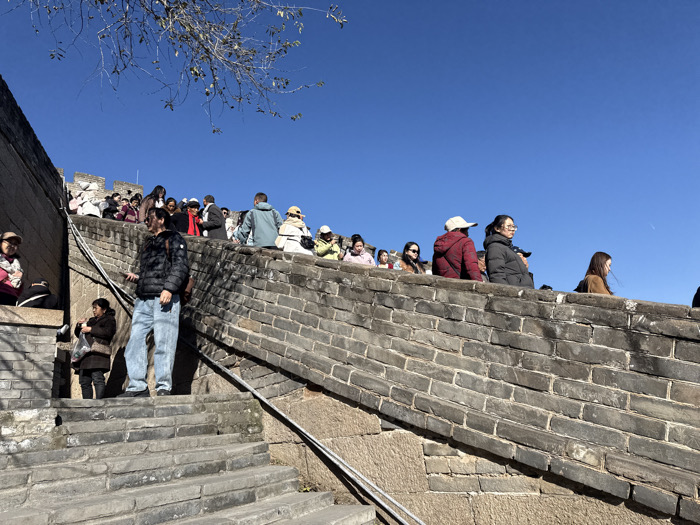 The image displays a clear, sunny day at a section of the Great Wall of China in Yanqing District, China. A steep, stone staircase ascends from the lower-left to the upper-center, bordered on the right by a high, sloped wall constructed from dark grey, cut stone bricks. A thin, light-colored rope or cable acts as a handrail alongside the staircase. Approximately 20-30 individuals, primarily appearing East Asian, are distributed across the visible section of the wall and steps. They are dressed in casual, cool-weather attire, including puffer jackets, sweaters, and hats. In the mid-ground, a male subject in a dark puffer jacket and light blue jeans stands on the stone steps, facing left and holding a dark object in his right hand. To his left and slightly below, a female in a dark jacket holds a white bag. Further to the left, a female in a light jacket and hat is seated on a stone ledge. Numerous other individuals are visible on the higher sections of the wall and steps, walking, standing, and observing. Several are positioned along the wall's top edge, looking outwards. The upper two-thirds of the frame are dominated by a clear, bright blue sky, with a few sparse, leafless tree branches partially extending into the upper-left corner. The scene is brightly illuminated by direct sunlight.