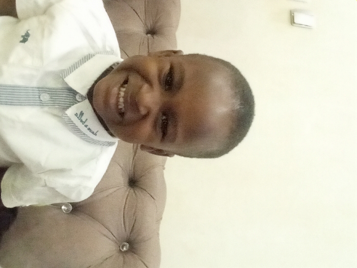 The image displays a head-and-shoulders portrait of a young male child with dark skin and short, dark hair. He is positioned centrally, looking directly at the camera with a wide, open-mouthed smile, revealing teeth. The child wears a white collared shirt with short sleeves. The collar features dark embroidery, and the placket is vertically striped in light blue and white. A small, dark-colored elephant logo is embroidered on the left side of the shirt. The subject is seated or positioned in front of a light brown or beige upholstered piece of furniture, possibly a sofa or chair, which exhibits tufting with visible crystal or glass-like buttons. This furniture occupies the lower right portion of the frame behind the child. The background consists of a plain, light-colored wall, likely beige or off-white. A rectangular, light-colored object, possibly a light switch or electrical outlet cover, is visible on the upper left portion of the wall. The scene depicts an indoor environment; no visual elements within the image confirm the location as Barden Yana, Nigeria.