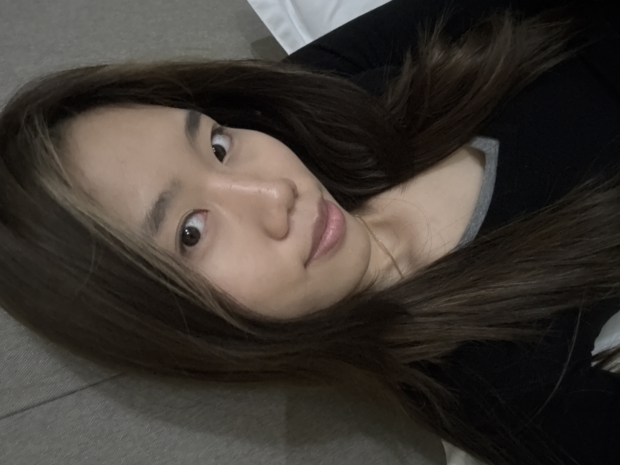 A woman with long, brown hair lies on a grey surface, presumably a sofa or bed, wearing a black shirt with a grey collar